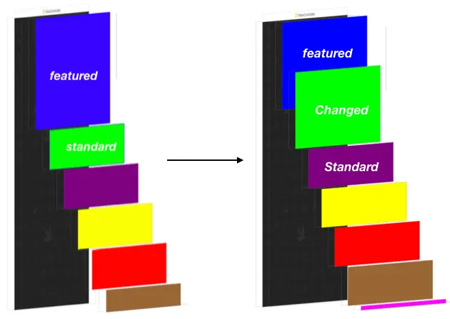attribute.zIndex的值随着iterm的增加逐渐增大,形成上图所示的覆盖效果。ChangedCell的高度随着偏移距离,由standardHeight变化为featuredHeight。- 从视觉上看由