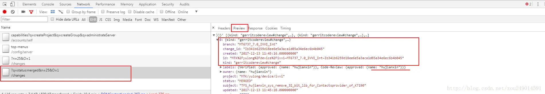 print(one["project"], one["branch"], one["subject"], one["owner"]["name"], one["updated"], one["_sortkey"])