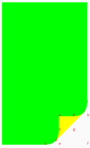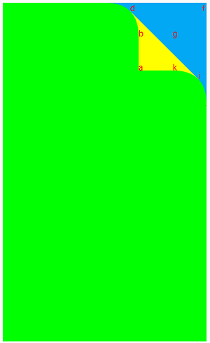 书籍翻页效果的实现就是要以我们触摸屏幕位置的坐标为基础绘制出这三个区域,形成模拟翻页的特效。要绘制这三个区域,我们需要通过一组特定的点来完成,这些点的坐标需要通过两个已知的点(触摸点、相对边缘角)计算得到,下图我将各个特定点的位置和计算公式贴出来,大家对照着原理一起理解(渣画工望体谅 ╮(╯▽╰)╭ ),其中b点是由ae和cj的交点,k点是由ah和cj的交点
