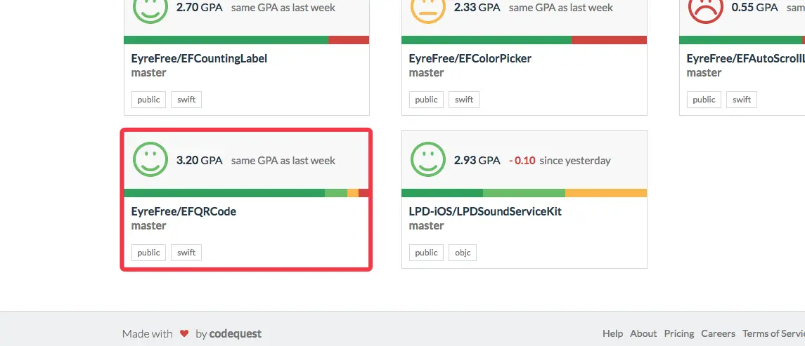 CodeBeat 的同类产品有 Code Climate,目前支持 Ruby、Python、PHP、JavaScript、Java、TypeScript,不过官网显示 Swift、Go、Objective-C 的支持在计划中,因为我是 iOS 开发,所以暂时用不了这个,在一个 Ruby 项目有试过这个,看起来还好,有兴趣的同学也可以一试。