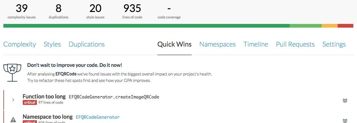 点击进入该项目的分析结果,可以查看到具体的问题,如代码复杂性、代码风格、代码重复等,点击 Quick Wins 这一栏可以查看优先推荐修复的项目,如下图所示: