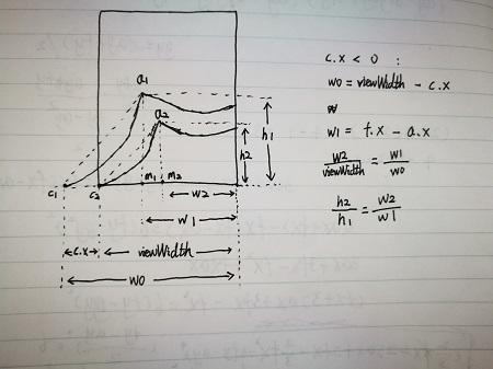 图中我们将触摸点标为a1,与a1对应的c点标为c1,此时c1的x坐标是小于0。而a2是我们重新计算得到的a点,也就是最后进行绘制的a点,其对应的c点标为c2,c2位于View的左下角(x坐标为0),容易观察到直角三角形a1 c1 m1与直角三角形a2 c2 m2相似,此时f点位于View的右下角(在右上角同理),因此我们可以通过相应的公式计算得到a2的坐标为(f.x-w2,f.y-h2),得到计算a2的方法后,我们修改原来的BookPageView