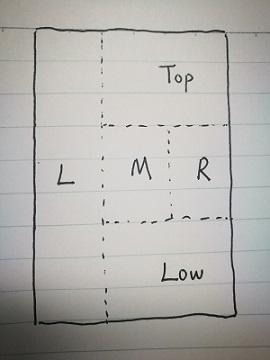 既然我们实现的是仿真的翻页效果,翻页除了从上下两角翻,自然还能横向水平进行翻页。我们先将View划分成上下左右中五个区域,如图