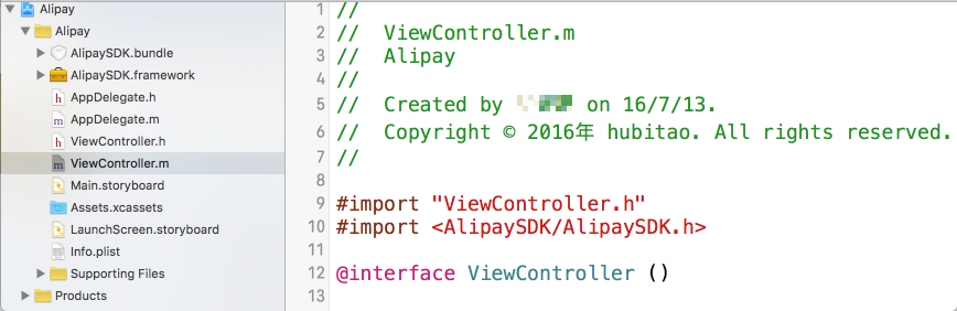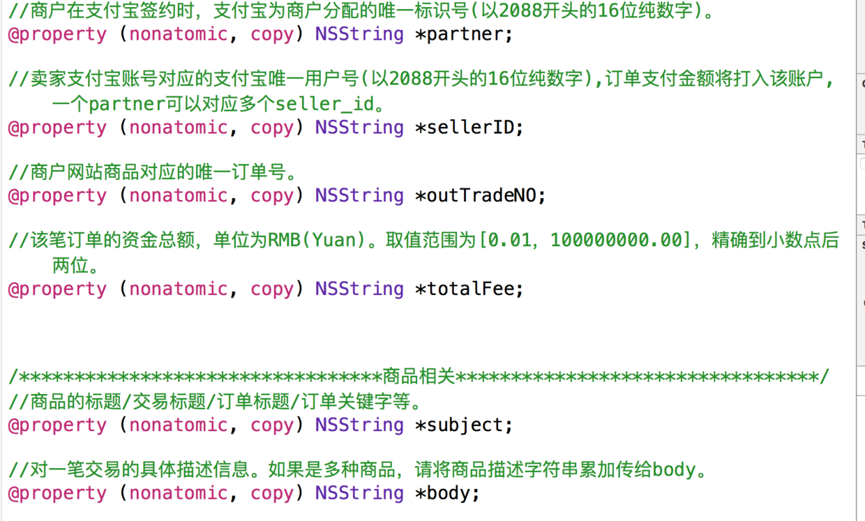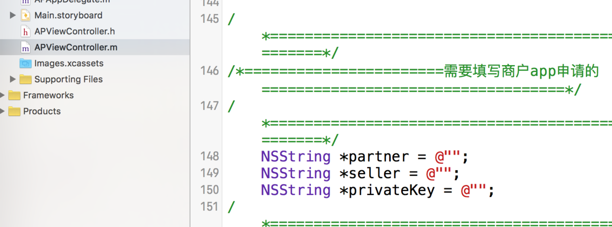 图6中所示在APViewController中有三个字符串变量,和图5当中的提示是一样的,这个玩意儿就是商户和阿里签订协议后得到的一系列标示符。到时候和公司要。