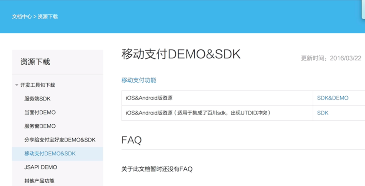 进入到图2点击左侧移动支付Demo&SDK再点击右侧的iOS&Android版资源,点击右侧SDK&DEMO下载SDK