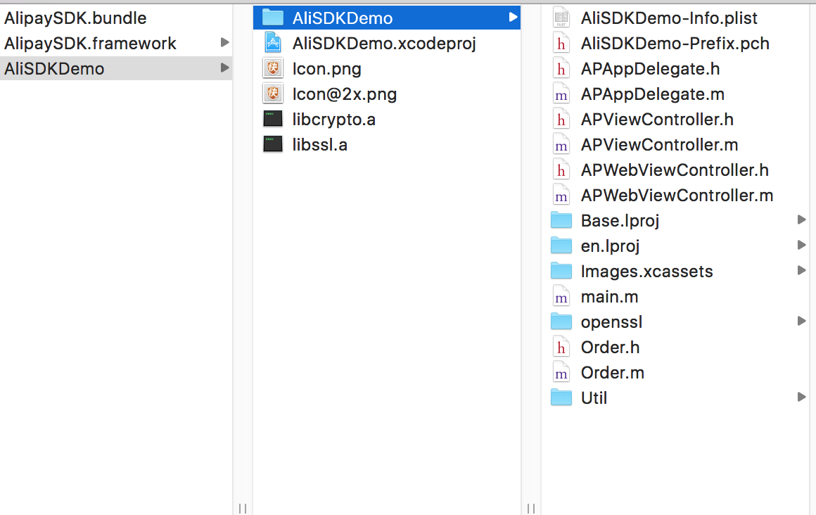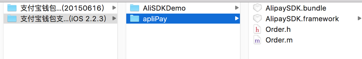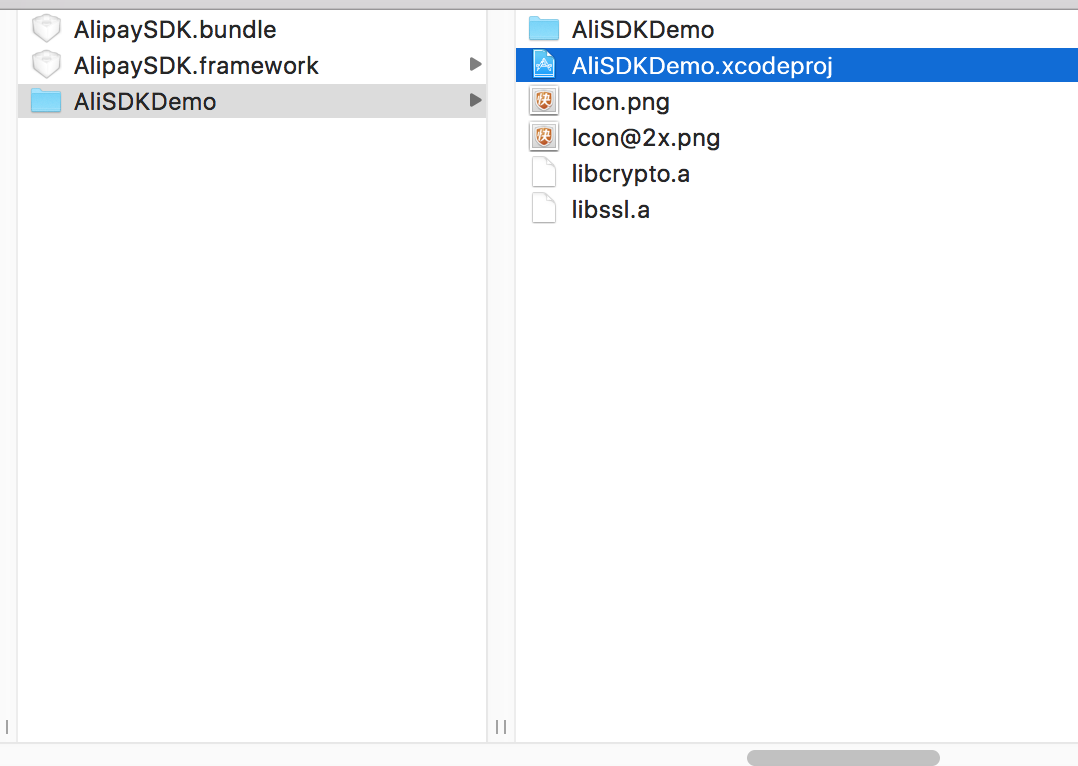 回到刚才下载的demo中有两个文件 AlipaySDK.Bundle和AlipaySDK.framework。将这两个文件拷贝到项目中