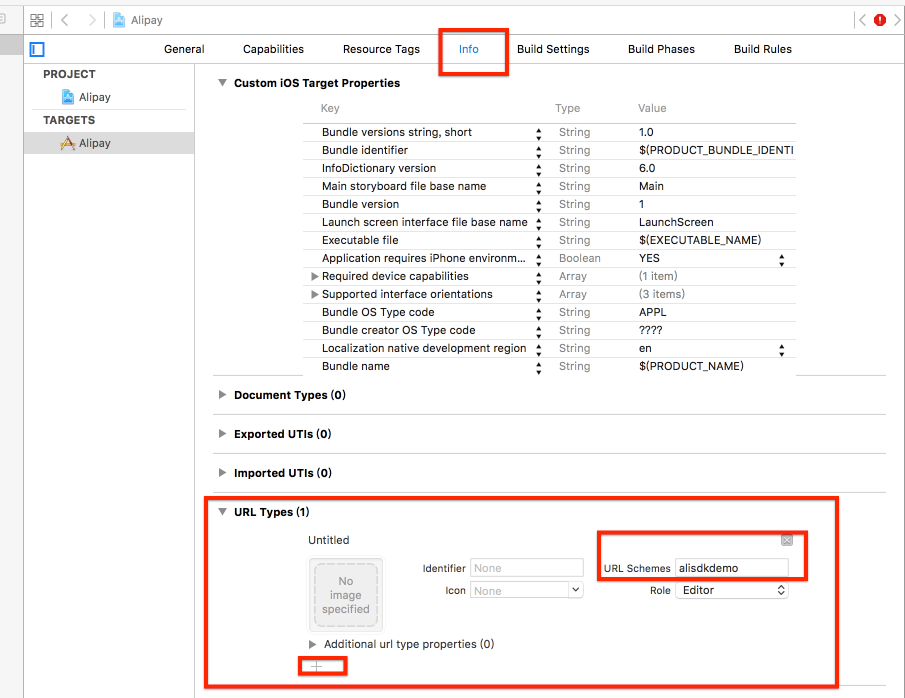 在复制完NSString *appScheme = @"alisdkdemo";这一句后需要在项目配置中点击info在下面的URLType中添加一个type,URLscheme的值为alisdkdemo;