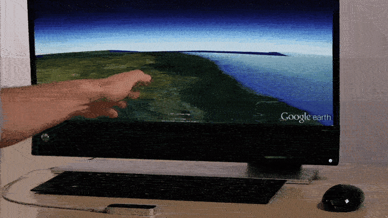 我们有两个原型,一个我们用手腕的方向来控制在三维空间中缩放物体时x,y,z轴的方向。另一个我们读取两个手指之间的矢量位置来选择轴向,两者的结果都不是很好。本身把手指放置在精确的x,y,z方向上感觉就不是很自然。我们感觉本体手势在调整交互方式上是很强大,但在空间位置上却不尽然。对于方向控制,我们还是觉得以下的方式更好:用手的倾斜来调整谷歌地图。