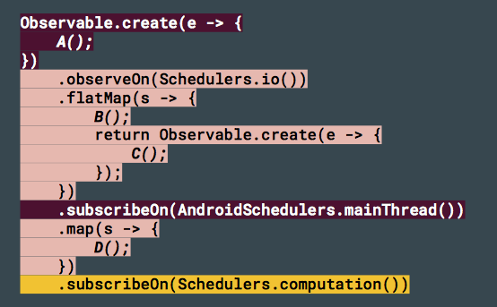 杨凡的栗子举的非常好。将每一个observeOn()当场一个弹球的挡板。
