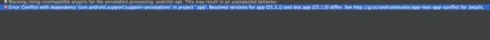 Error:Conflict with dependency 'com.android.support:support-annotations' in project ':app'. Resolved versions for app (25.3.1) and test app (26.0.2) differ. See http://g.co/androidstudio/app-test-app-conflict for details.