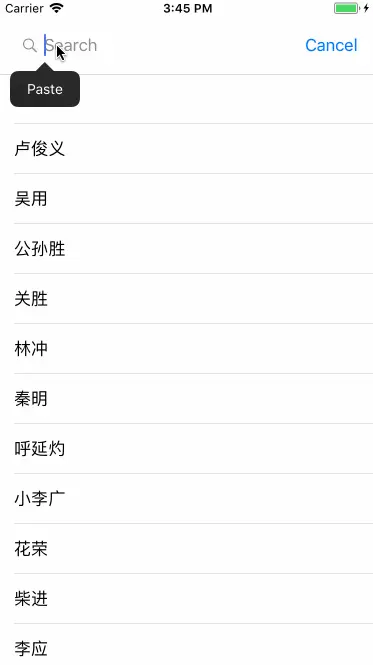 UISearchResultsUpdating代理方法- (void)updateSearchResultsForSearchController:(UISearchController *)searchController来实时获取输入的最新关键字,并遍历数据源,将匹配到的结果显示出来