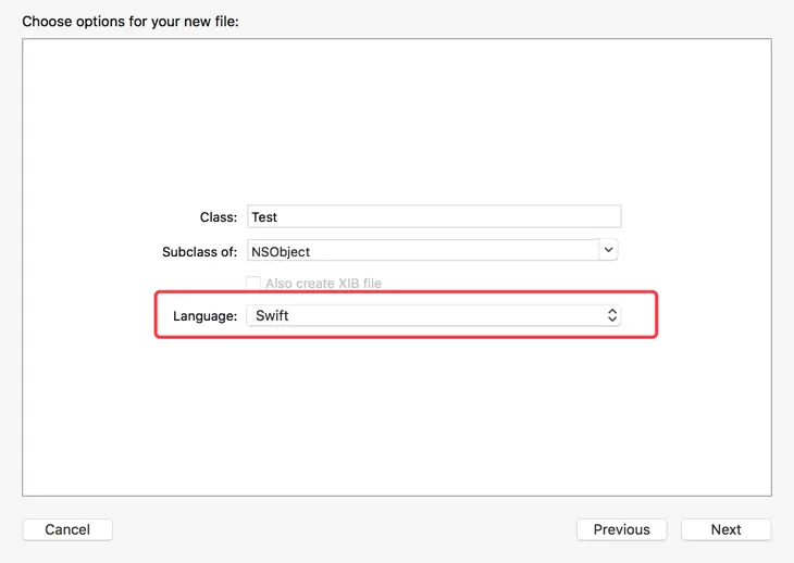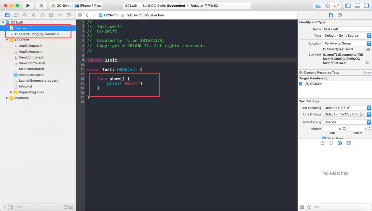 4、这是会多出两个文件。第一个是新建的 Test.Swift 文件,我们重点说下第二个 OC-Swift-Bridging-Header.h ,这个文件实质上是一个供Swift使用的头文件,在这里要把所有要暴露给Swift的OC头文件都添加进去,这样写Swift的时候就可以直接使用那些OC的类和方法啦。 Swift-OC-Bridging-Header.h 的组成是(项目名-Bridging-Header.h)。 我们在 Test.swift 中添加一个方法