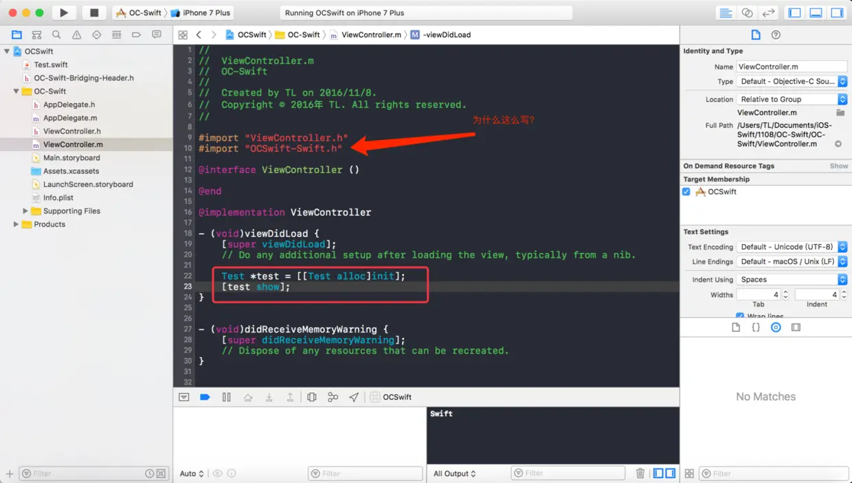 5、导入 OCSwift-Swift.h ,为什么这么写呢?其实就是 项目名-Swift.h ,这也是 Xcode 自动生成的,根据你写的所有 Swift 代码,生成一个 OC 的.h文件,进行类和方法的声明,这样在 OC 里引用这个头文件后,就相当于引用了所有 Swift 声明,然后就可以直接使用了。接着两行代码用 Test.swift 的方法,编译并运行,我们观察控制台输出