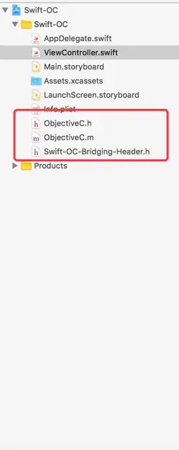 3、创建 OC 类文件成功,这是会多出三个文件。前两个和以前一样,注意第三个 Swift-OC-Bridging-Header.h ,这个文件实质上是一个供 Swift 使用的头文件,在这里要把所有要暴露给 Swift 的 OC 头文件都添加进去,这样写 Swift 的时候就可以直接使用那些OC的类和方法啦。 Swift-OC-Bridging-Header.h 的组成是(项目名-Bridging-Header.h)