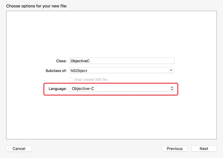 2、新建ObjectiveC类,注意语言选择OC