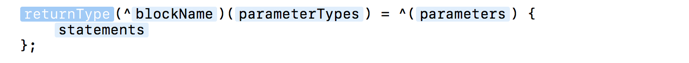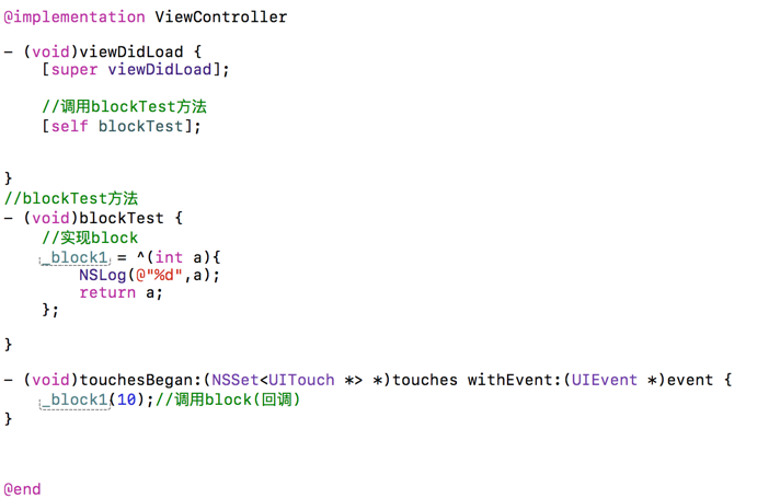 实现:^(参数列表){代码块}返回值类型 (^block变量名)(参数列表) = ^(形参列表){