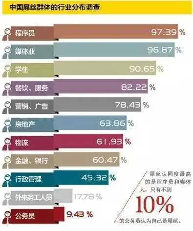 人们提到IT人的时候,总会想到他们呆板、不解风情,专注于IT技术,就算性感的美女躺在旁边也无动于衷。事实真的是这样吗?虽说不能完全否定有这样的情况存在,但这是IT人普遍的特点吗?而其它行业也有很多这样的人,那为什么人们总是拿程序员说事?下图为2013年网上曾经流传的一张屌丝分布图,程序员行业居首。