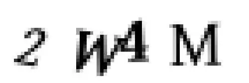 我们并不能手动地用 Photoshop 等图像软件将它们分割开,因为训练图像总共有 1 万张。此外,我们也不能将图像切分为四个等大小的图像块,因为 CAPTCHA 会随机地将这些不同的字符放置在不同的水平线上,如下所示: