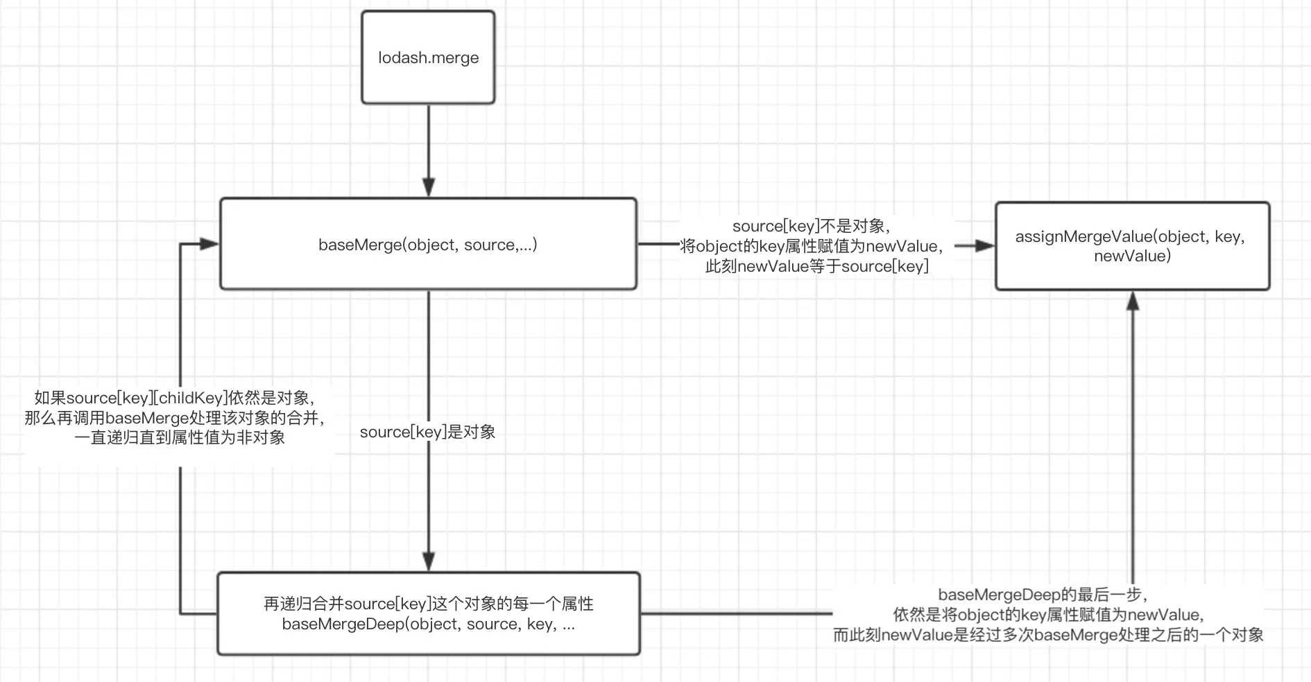 这里简单画了一下lodash.merge在处理深层次对象合并的流程图帮助理解: