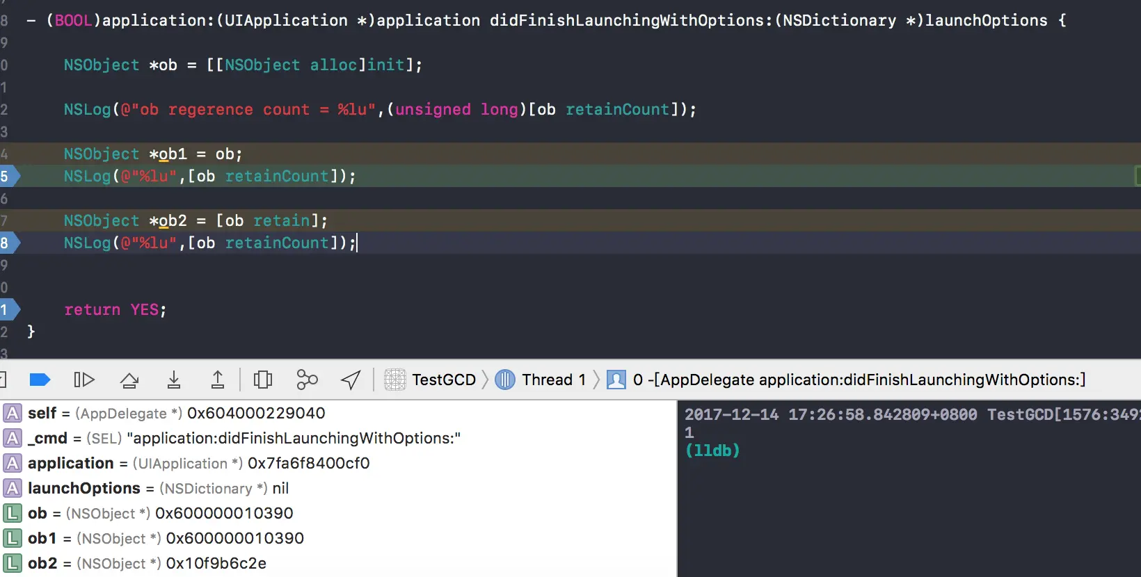 这个时候我们如果调用[ob release];或者[ob1 release];或者[ob2 release];起到的作用其实是一样的,他们都是告诉内存块:喂,老兄,你的引用计数要减一啊。如果我们不给ob或者ob1或者ob2置空的话,这三个指针还是存在的,只要内存块的引用计数不为0的话,我们调用[ob retainCount]或[ob1 retainCount]或[ob2 retainCount]的结果是一样的,一旦内存块引用计数为0,该对象在堆上的内存就会被系统释放,我们在调用 [*** retainCount]就会有野指针崩溃(指针指向的内存地址已经被释放了),所以要及时给指针置空。