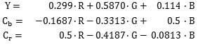 图像被分割成大小为8X8的小块,这些小块在整个压缩过程中都是单独被处理的。我们常见的“RGB”模型,就是把颜色分解成红绿蓝三种分量,这样一张图片就可以分解成三张灰度图,数学表达上,每一个8X8的图案,可以表达成三个8X8的矩阵,其中的数值的范围一般在[0,255]之间。而在JPEG压缩算法中,需要把图案转换成为YCbCr模型,这里的Y表示亮度(Luminance),Cb和Cr分别表示绿色和红色的“色差值”。最终可以得到RGB转换为YCbCr的数学公式为:
