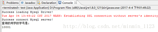 出现两条success语句即Success loading Mysql Driver! 和 Success connect Mysql server! 和测试结果证明成功连接。(测试结果里第二行为warning不影响结果)