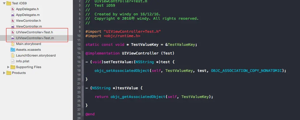 objc_setAssociatedObject(self, TestValueKey, test, OBJC_ASSOCIATION_COPY_NONATOMIC);