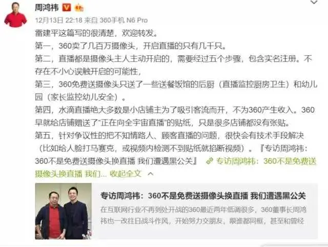 一篇《一位 92 年女生致周鸿祎:别再盯着我们看了》将这家在安全领域屹立 12 年的互联网安全企业推向了风口浪尖。具体内容想必各位读者多少都有所了解,我们简单的总结一下这位姑娘的观点:360 水滴摄像头的直播功能,暴露了无数公众的隐私。此文一出,立刻就在众网友的朋友圈刷屏疯转,360 顿时成为了众矢之的。