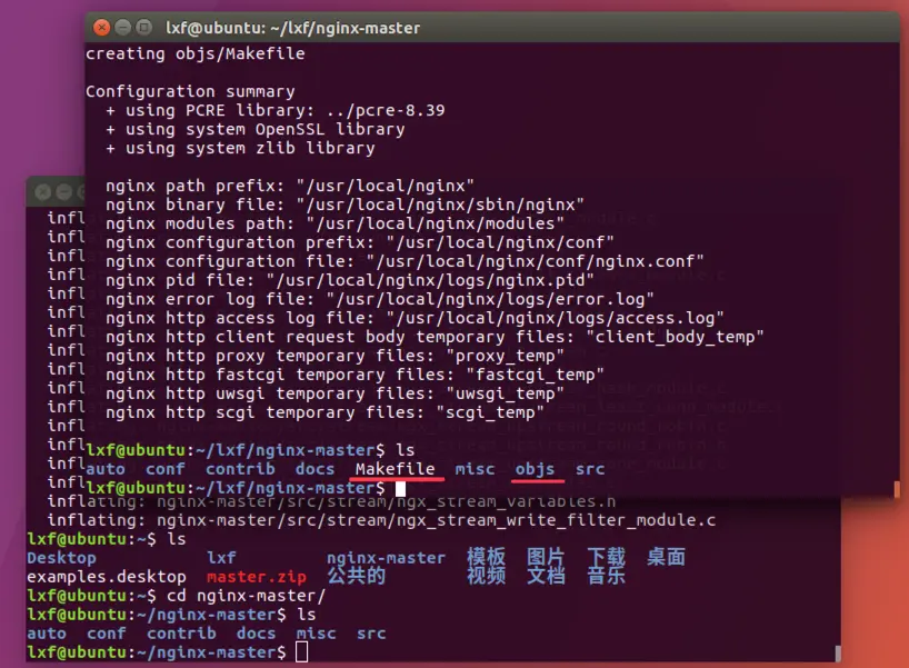 配置好之后会多出一个Makefile文件(一种配置文件,定义了一系列的规则来指定编译操作)与objs文件夹