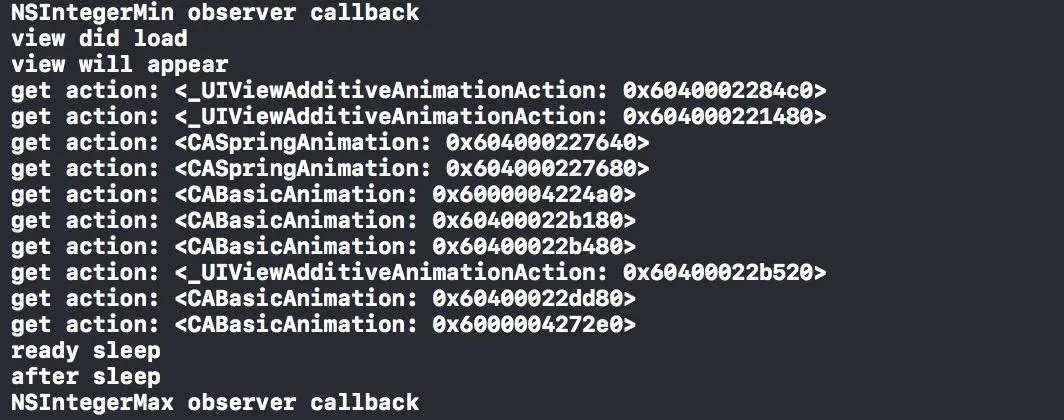 在上面的log中可以看到viewDidLoad和viewWillAppear的调用同样处在before waiting阶段。假设这两个方法的调用时机在transaction前面,那么一旦两个方法发生了卡顿,肯定会跳转动画卡帧后执行的效果。通过分别在两个方法中添加sleep操作测试,还原了gif的卡顿效果。因此可以得出转场动画过程中的流程: