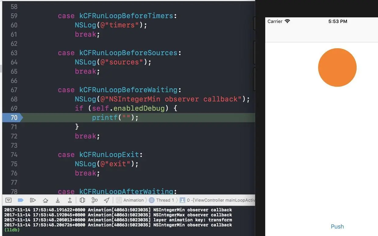 通过断点和界面显示可以看到在Before Waiting阶段的两次回调之间,transaction完成了属性修改的渲染任务(在DEBUG+断点状态下,隐式动画不能很好的完成动画效果):