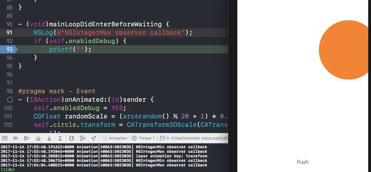 隐式动画的修改最终由CATransaction事务完成,它在主线程的runloop注册了一个监听者,具体回调发生在before waiting阶段。在回调中会将所有implicit transactions以动画的形式展示。虽然苹果文档没有明说具体的回调时机,但通过简单的测试可以定位transaction的回调时间:通过注册两个runloop监听者,回调优先级分别设为NSIntegerMax和NSIntegerMin,监控最早和最晚的回调阶段,并且在对应位置添加断点,查看断点前后图层是否更新: