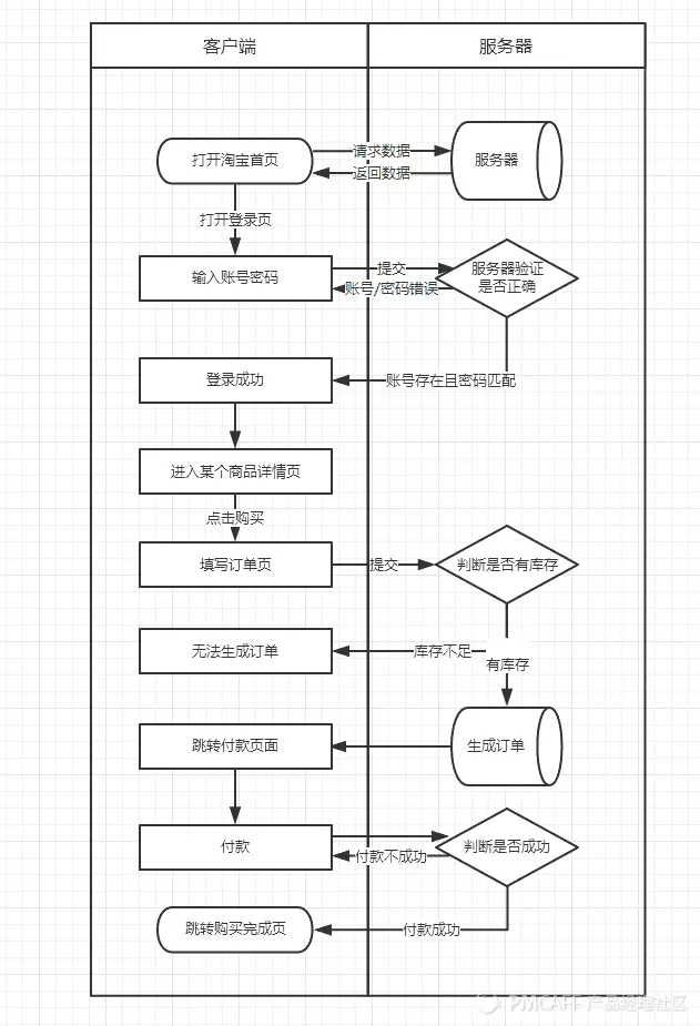注意上图服务内的部分,看起来步骤非常少,也非常简单,而真实的服务器肯定有更多复杂的逻辑判断。但对于产品经理画的流程图来说,不可能完完全全描绘编程中的技术细节,而且也不需要产品经理去帮技术想代码的实现逻辑。我们要做得是,理解程序宏观的实现逻辑。
