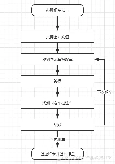 如果要追溯最早的共享单车,恐怕就是政府推出的有桩自行车。其推出目的无非就是缓解交通压力,以及减少环境污染。而当时受限于成本、技术以及大众人群的普遍素质,有桩自行车的解决方案是极其不方便的。想要租一辆有桩自行车,首先要凭身份证在相关单位办理IC卡,并缴纳押金和预存费用,然后租车和还车只能在定点位置进行。先不谈办理卡片有多麻烦,租车还车有多不方便,超时扣费有多惊人,如果只单纯将其用业务流程图展示出来,应该是什么样的呢?