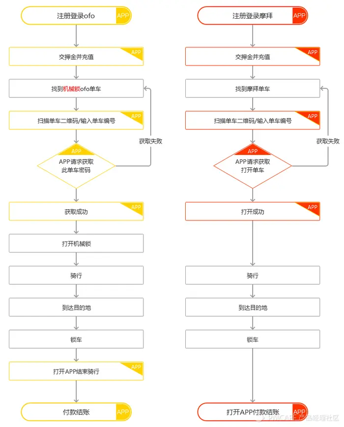 我们可以清楚地看到摩拜的流程比ofo的少了两个节点,而这就是摩拜对比ofo第一代机械锁的优势。当然,ofo第一代也有其他方面是优于摩拜的,比如骑车的舒适程度。但本文主要聚焦于产品流程,所以并不在单车体验上花费太多笔墨。