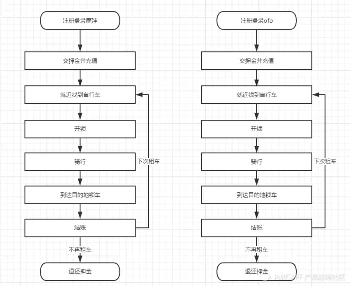 单看有桩单车的流程图其实没有任何意义,真正的意义在于有桩单车和目前摩拜与ofo的横向对比,下面看一下两家共享单车的业务流程图: