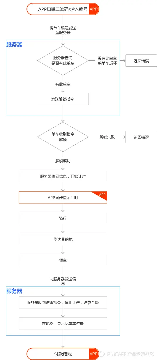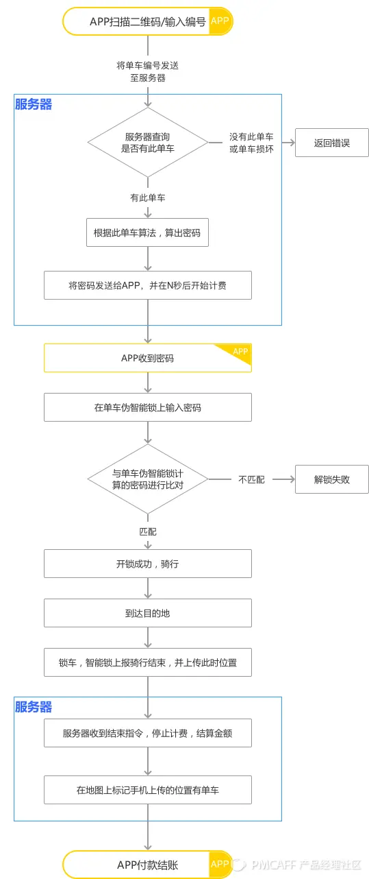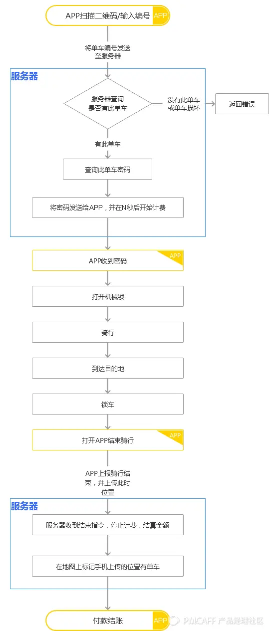 因为单车的使用流程不仅是在APP上,还有一部分操作在实体自行车上,这时就不能单使用页面流程图,而是要直接使用功能流程图。并且这里的功能流程图不局限于页面内的功能,而是要表达用户对单车和APP的每一步操作。