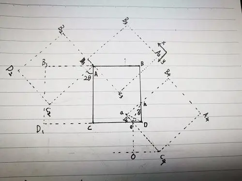 旋转2倍角0的度数得到矩形AB₂C₂D₂(经过翻转和旋转后,此时我们的XY坐标轴方向在图中右上方已经标出来了) 解析:①设 角ehD为 角0, 角heD为 角1,因为 eh为 aD的 垂直平分线,则 角ahD大小为两倍 角0; ②又因为我们要求 AC₂与 B4 D4平行,且 AC和 BD平行; ③所以 角C₂AC等于 角ahD,为两倍 角0; ④所以旋转角度为两倍 角0