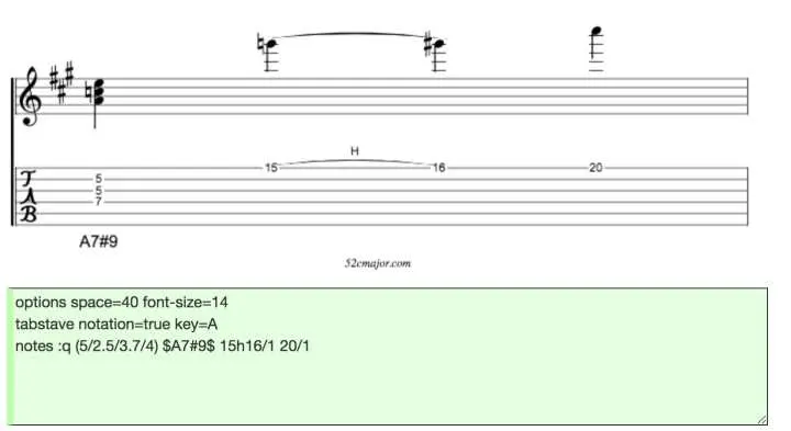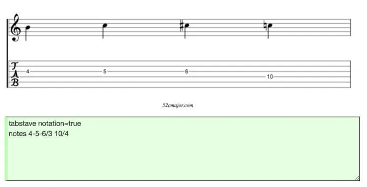 关键字notes可以用于添加音符。你可以通过在钢琴上的位置(note/octave)或者吉他指板的位置(fret/string)来表示。如果需要在同一根弦或者同个音区添加多个音符,可以通过这种表达式:fret-fret-fret/string (或者 note-note-note/octave)。根据你个人的喜爱来选择即可。
