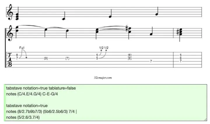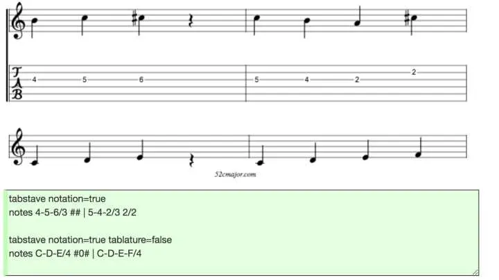 tabstave notation=true代表显示标准五线谱和六线谱。tabstave notation=true tablature=false代表只显示五线谱。tabstave notation=true clef=alto表示女低音谱号。tabstave notation=true clef=bass key=C# time=C|表示 4/4 拍的低音,同时包含五线谱和六线谱。