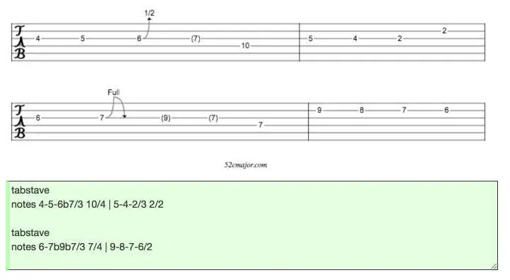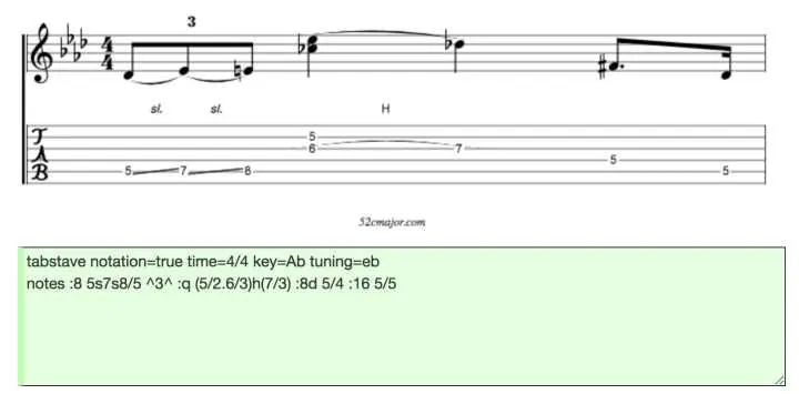 下面是更复杂的例子,它演示了如何在滑音,推弦音等其他技巧音上使用音长。请你认真体会。