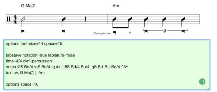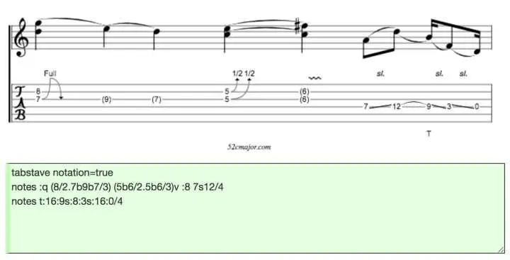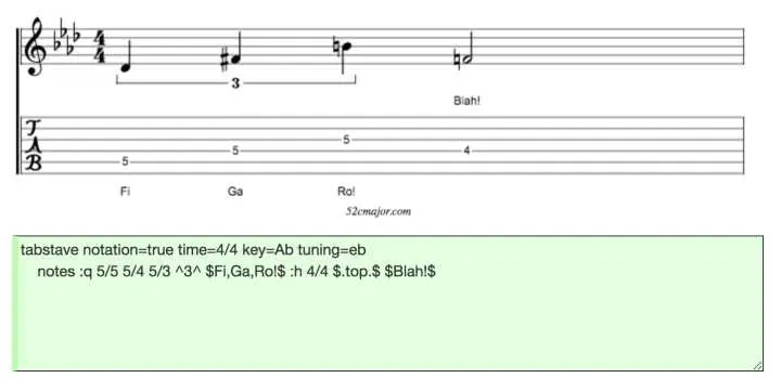 VexTab 还提供了一种非常灵活添加文本的方式,利用text关键字可以创建和音符垂直对齐的文本,这种方式非常合适于放置和弦的名称。