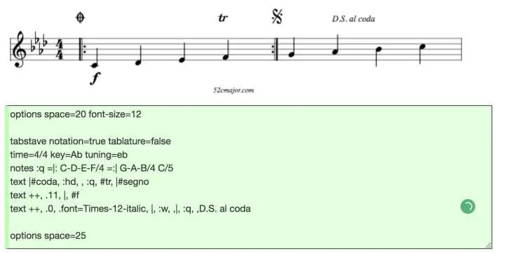 还没完,你还能在文本上添加很多音乐符号,比如结尾和重复。只需要在关键字前面加上#就可以了,e.g., text #coda。