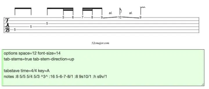 这四种技巧分别用h, p, t 或者 s,这个和一般吉他谱的表示是一样的。比如你要从6击弦到8然后再勾弦回6,就可以用6h8p6,你也可以在和弦上使用这些符号。