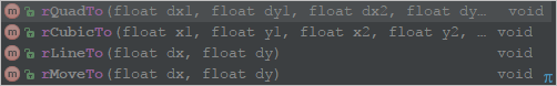 rXxxTo方法的r意思是relative,即相对的意思,方法有四个,如上图所示,其功能与对应的xxxTo方法一样,区别在于rXxxTo方法在绘制Path时是以当前path画笔位置为坐标原点,即相对于path画笔位置进行绘制,而xxxTo方法的坐标原点则与当前canvas坐标原点一致。例如,我们使用xxxTo方法