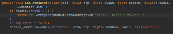 | addRoundRect(float left, float top, float right, float bottom, float[] radii,Direction dir) | 添加非统一圆角的圆角矩形,left、top、right、bottom组成矩形区域,radii:矩形四个椭圆圆角的横轴半径和纵轴半径的数组,一共8个数值,dir:线的闭合方向(CW顺时针方向 | CCW逆时针方向) |