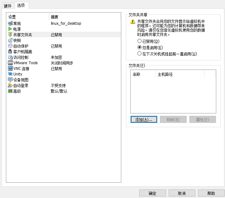 2、切换到到”选项“,点击”共享文件夹“,把“文件夹共享”更改为“总是启用”;然后点击“添加”