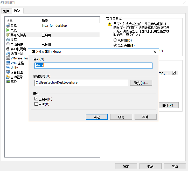 4、选一个你电脑本机的文件夹,作为和虚拟机系统的共享文件夹,共享文件夹的名称会自动生成