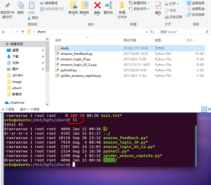 5、共享文件夹的目录在虚拟机里面一般会在/mnt/hgfs这个文件夹下面,然后打开虚拟机里面的linux系统,然后ctrl+alt+t快速调出命令行工具,输入:/mnt/hgfs/share,就能进入共享文件夹中。然后输入“ll”查看共享文件夹羡慕的文件和本机对应的share文件夹是一样的。共享文件夹配置成功。