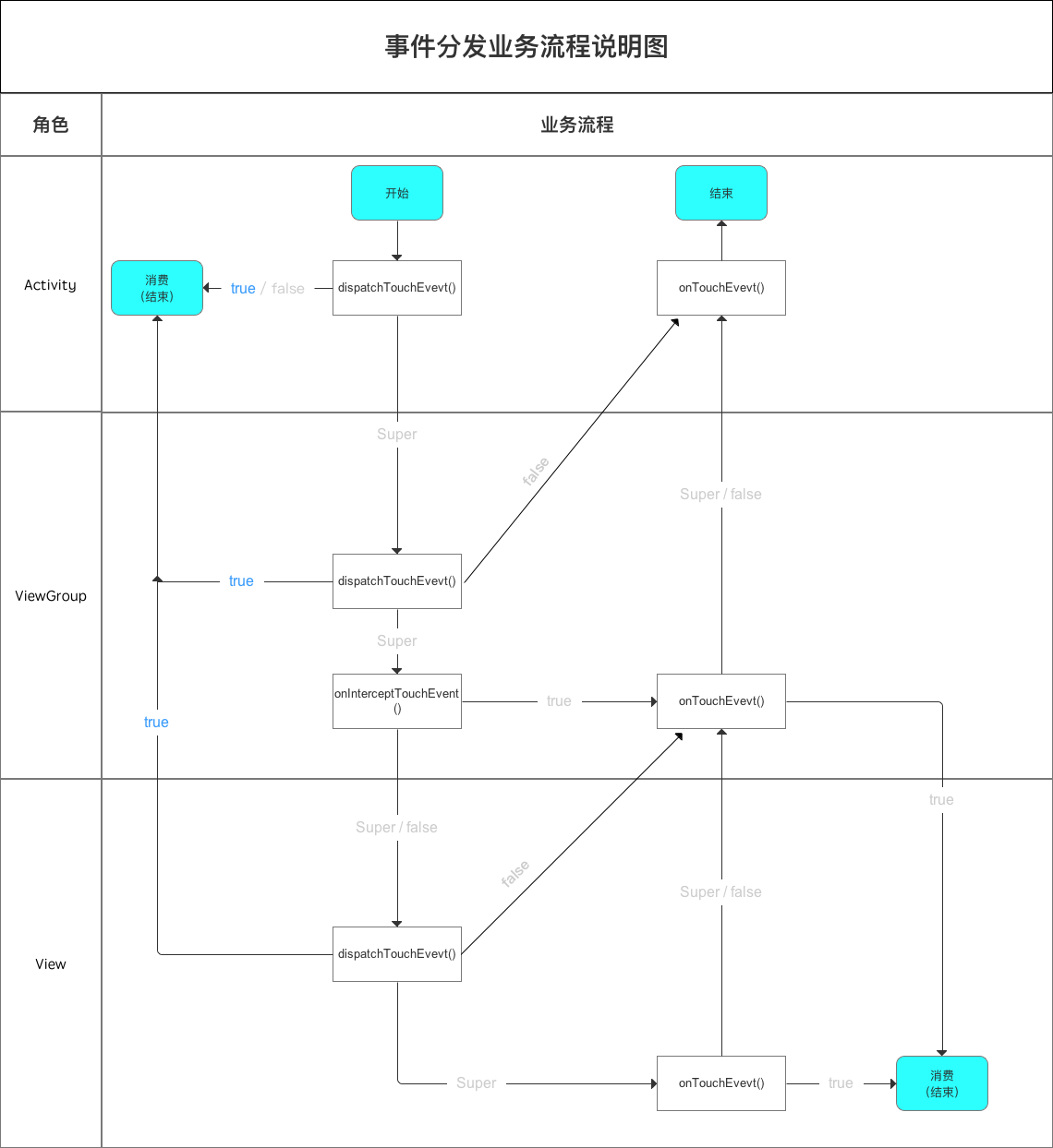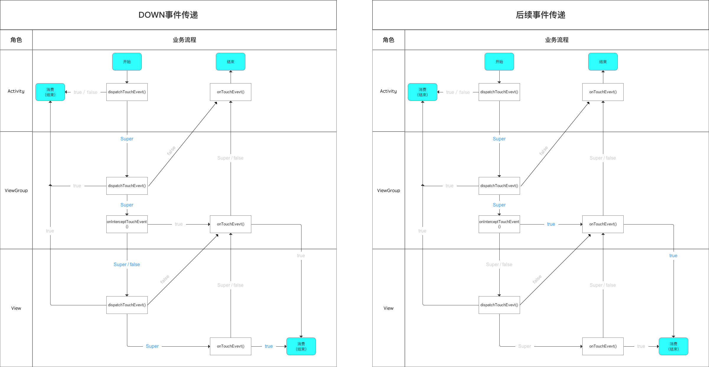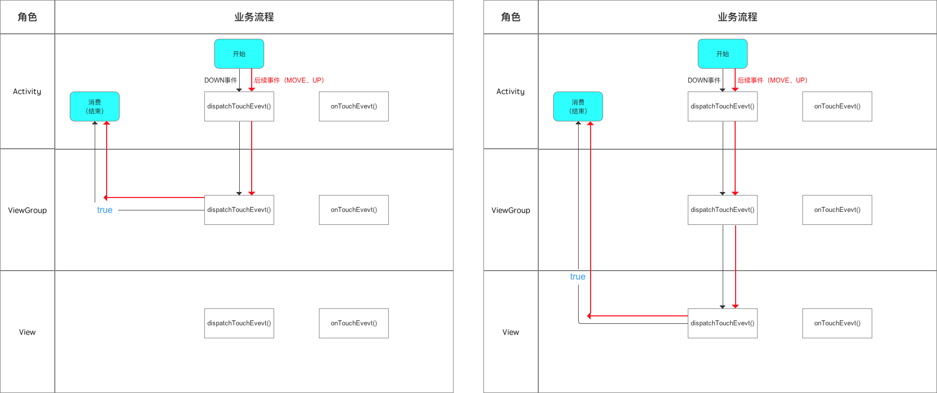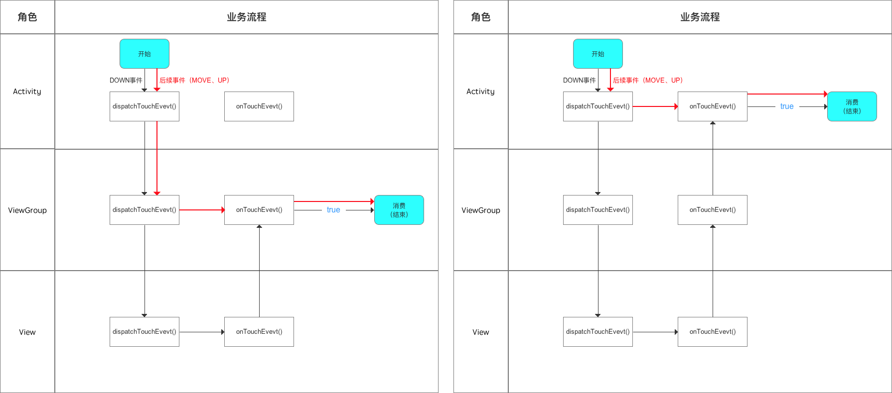 - 如果在某个对象(Activity、ViewGroup、View)的onTouchEvent()消费事件(返回true),那么ACTION_MOVE和ACTION_UP的事件从上往下传到这个View后就不再往下传递了,而直接传给自己的onTouchEvent()并结束本次事件传递过程。